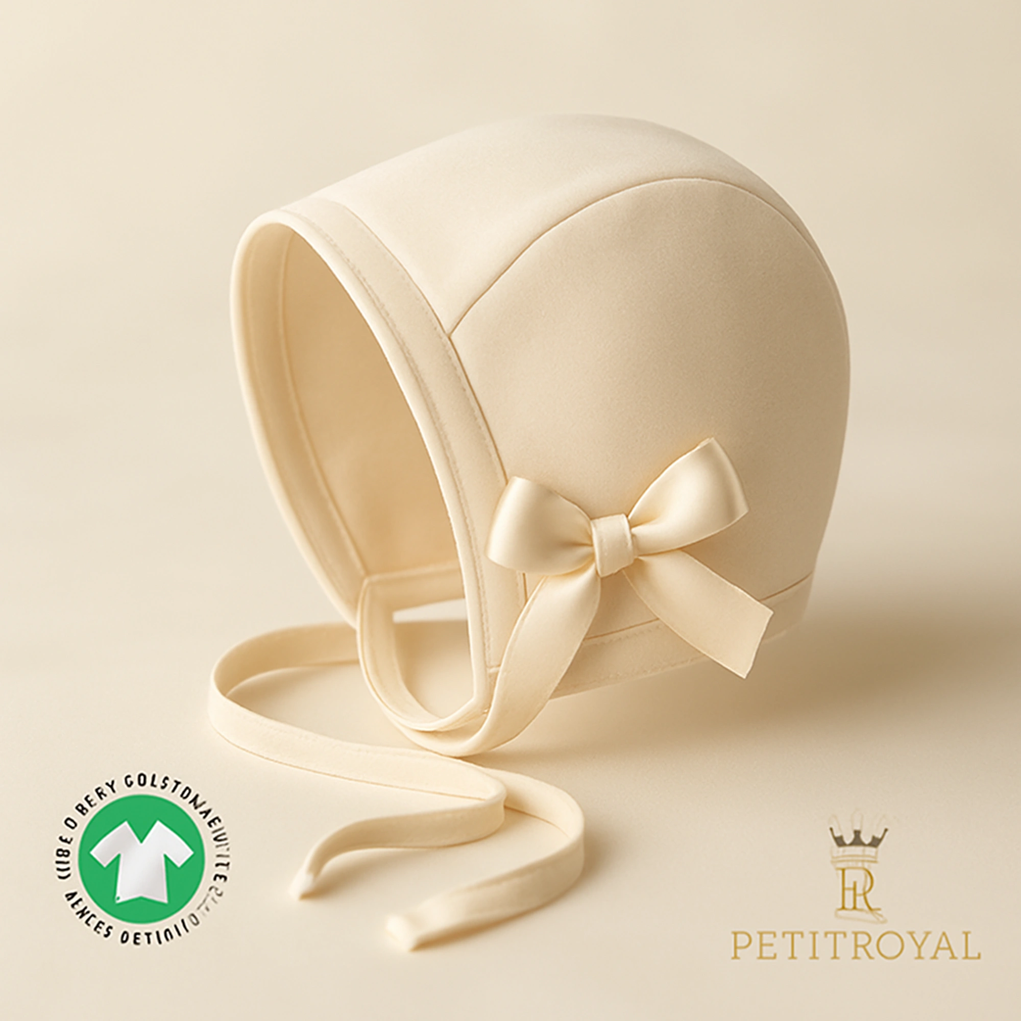 Festliches Bio-Häubchen in Champagner, handgefertigt mit Spitze & nachhaltigen Materialien.