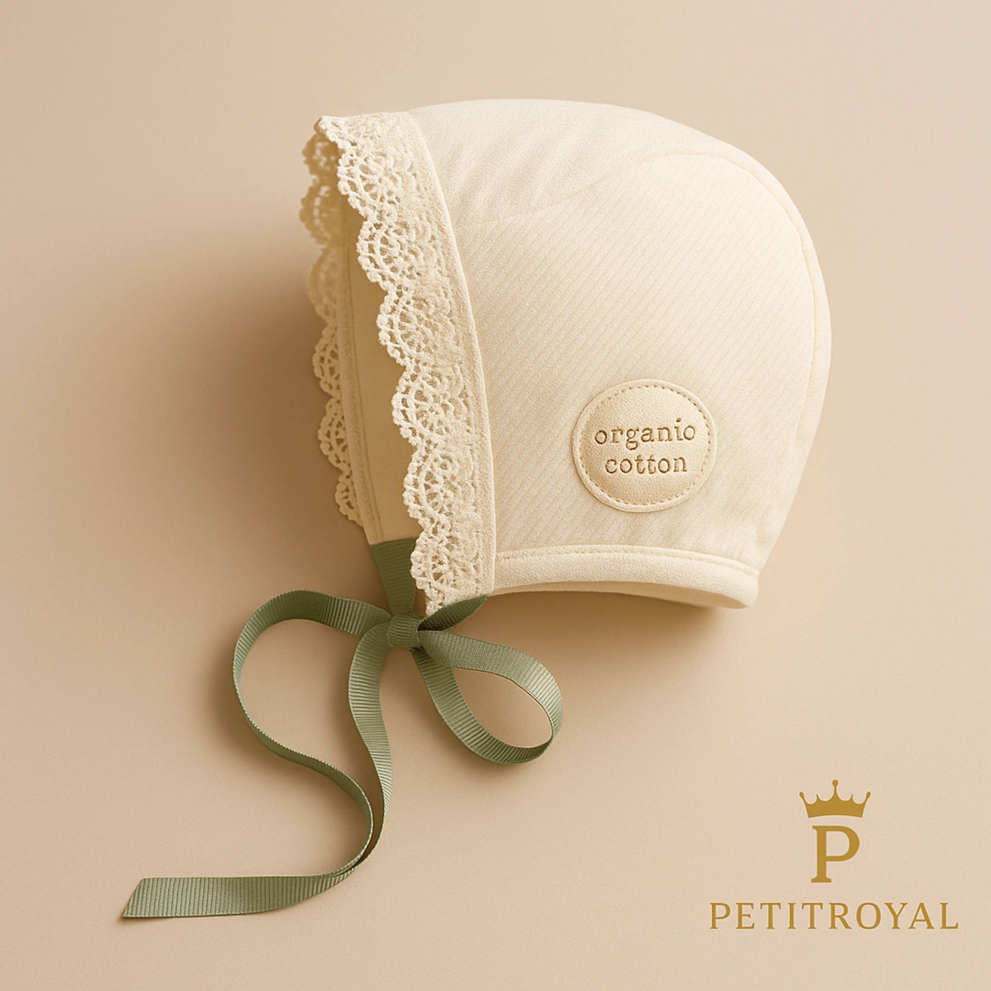 Festliches Bio-Häubchen in Salbei, handgefertigt mit Spitze & nachhaltigen Materialien.